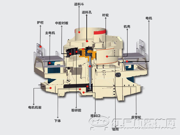 制砂機(jī)一般結(jié)構(gòu):制砂機(jī)主要由進(jìn)料口、溢料裝置、轉(zhuǎn)子、破碎腔、驅(qū)動(dòng)裝置及機(jī)座這幾大部分組成。其工作原理是:物料由進(jìn)料口進(jìn)入破碎機(jī),在破碎機(jī)頂部由溢料裝置將物料分為兩部分,一部分經(jīng)溢料口進(jìn)入破碎腔,另一部分直接進(jìn)入轉(zhuǎn)子,物料以50-80m/s的速度從轉(zhuǎn)子內(nèi)三個(gè)均布的流道口發(fā)射出去,與溢料流發(fā)生碰撞,然后一起沖向破碎腔內(nèi)的物料墊,被物料墊反彈,斜向上沖擊到破碎腔的頂部,又改變其運(yùn)動(dòng)方向,偏向下運(yùn)動(dòng),與溢流石料重新組合,這樣每塊物料在破碎腔內(nèi)受到兩次甚至多次破碎作用,而后從破碎腔落下由排料口排出。在整個(gè)破碎過程中實(shí)現(xiàn)的是物料與物料的碰撞,有效地減少了磨損。